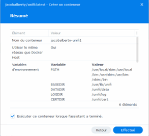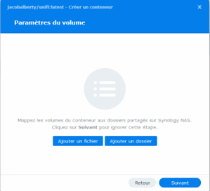 Cela permet au conteneur UniFi Controller de stocker ses données et ses journaux dans les emplacements appropriés sur votre NAS, facilitant ainsi la sauvegarde et la restauration. Vérifiez bien que les chemins correspondent à la structure de dossiers créée précédemment avant de poursuivre la configuration.