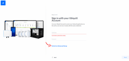 Ensuite, ignorez les champs Ă remplir et cliquez sur « Switch to Advanced Setup » pour passer la configuration en mode avancĂ©. Cette option permet dâĂ©viter la crĂ©ation ou lâutilisation dâun compte Ubiquiti. En mode avancĂ©, vous pouvez configurer le contrĂŽleur UniFi sans associer votre installation Ă un compte cloud Ubiquiti, tout en accĂ©dant Ă des paramĂštres supplĂ©mentaires adaptĂ©s aux infrastructures rĂ©seau complexes ou aux besoins spĂ©cifiques. Si vous souhaitez une installation locale et indĂ©pendante du cloud Ubiquiti, privilĂ©giez ce mode.