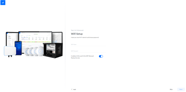 Ă cette Ă©tape, vous pouvez dĂ©finir le nom du rĂ©seau Wi-Fi (SSID) dans le champ « Wi-Fi Name » et choisir le mot de passe associĂ© dans « Wi-Fi Password ». Il est recommandĂ© dâutiliser un nom explicite pour le SSID afin de faciliter lâidentification du rĂ©seau, ainsi quâun mot de passe complexe pour renforcer la sĂ©curitĂ©. Une fois ces informations renseignĂ©es, cliquez sur « Next » pour poursuivre la configuration, ou sur « Skip » si vous prĂ©fĂ©rez configurer ces paramĂštres ultĂ©rieurement depuis lâinterface du contrĂŽleur UniFi.