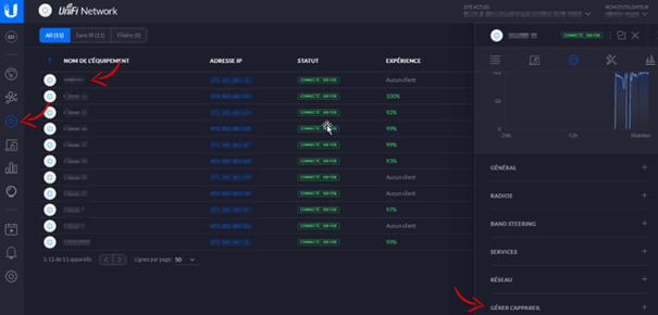 Tout dâabord, sur lâancien contrĂŽleur UniFi, accĂ©dez Ă la section « Ăquipements » et sĂ©lectionnez la borne Wi-Fi que vous souhaitez migrer. Cliquez ensuite sur « GĂ©rer lâappareil » pour afficher les options de gestion.