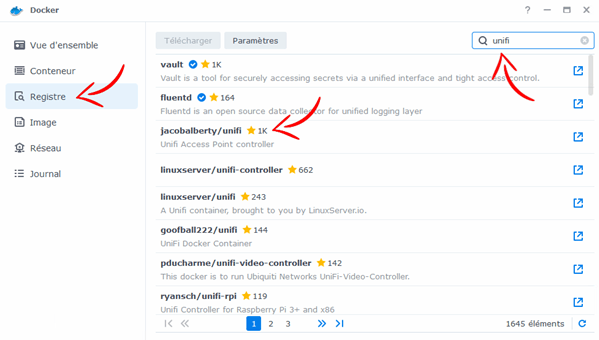 Pour installer lâimage du contrĂŽleur UniFi, ouvrez Docker puis accĂ©dez Ă lâonglet « Registre ». Dans la barre de recherche, tapez « unifi » et sĂ©lectionnez lâimage « jacobalberty/unifi ». Double-cliquez sur cette image pour lancer le tĂ©lĂ©chargement et lâinstallation. Patientez jusquâĂ la fin du tĂ©lĂ©chargement avant de passer Ă la crĂ©ation du conteneur.