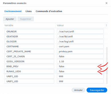 Ensuite, modifiez les variables dâenvironnement « BIND_PRIV » et « RUNAS_UID0 » en leur attribuant la valeur « false ». Cela permet dâexĂ©cuter le conteneur UniFi Controller sans privilĂšges Ă©levĂ©s, renforçant ainsi la sĂ©curitĂ© du systĂšme. AprĂšs avoir effectuĂ© ces modifications, cliquez sur « Sauvegarder » puis sur « Suivant » pour poursuivre la configuration du conteneur.